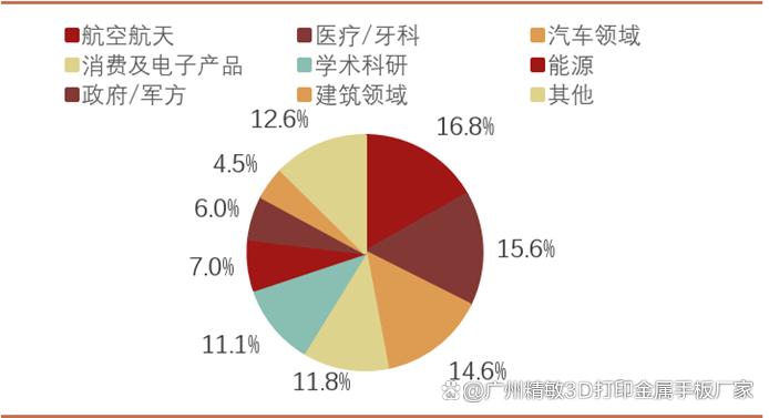 3D 打印目前已被广泛应用于航空航天、医疗/牙科、汽车、消费及电子产品、学术科研、能源、军工、建筑等领域,根据Wohlers Report 2022报告数据,2021年上述领域分别占比 16.8%、15.6%、14.6%、11.8%、11.1%、7.0%、6.0%、4.5%。