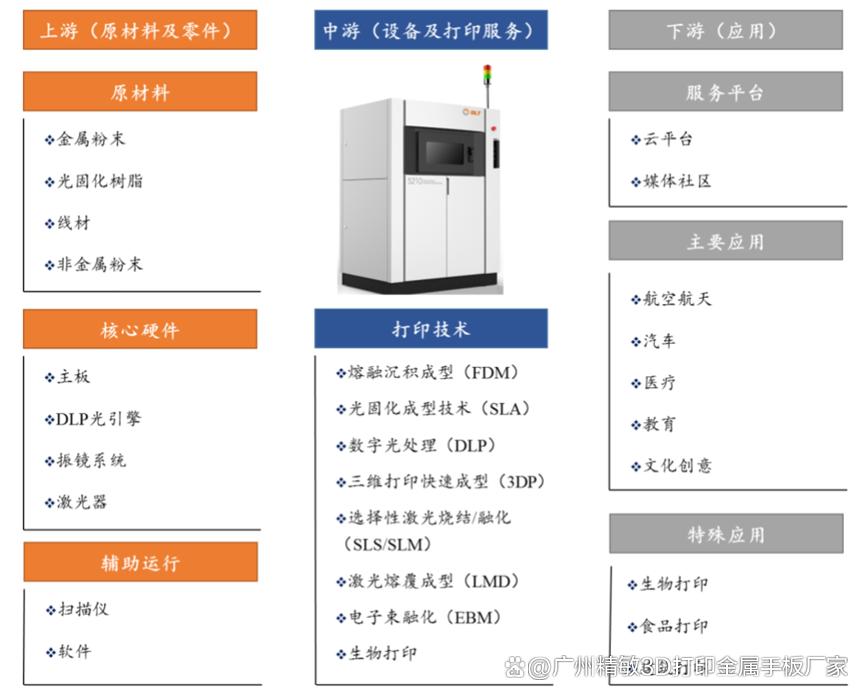 1)上游:主要包括3D 打印原材料、核心硬件、辅助运行供应商等
